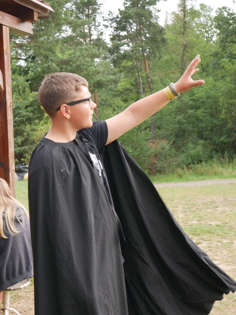 Dnes ráno jsme se vzbudili do světa Harryho Pottera. Ještě před snídaní jsme nasedli na košťata. Po snídani nás čekal turnaj ve famfrpálu. Bylo vedro, ale to nás nezastavilo, po dostačující odpolední pauze jsme museli ukrást drakovi vajíčka. Pak jsme luštili šifry, a nakonec našli pohár. Večer nás navštívil Voldemort a začal nám hrozit, že si pro nás půjde. Někdy v noci se odehrála bitva, ve které dobro zvítězilo.