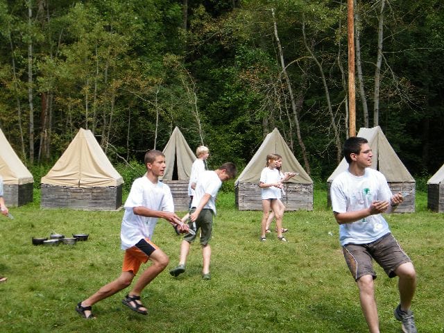 Ráno hnedka po budíčku byla snídaně a sporty Peti Vaškové (lakros a ufobal). Když už jsme byli úplně zpocení, byl oběd. Po obědě byl poledňák a pak svatba našeho syna. Dostali jsme panenku a její proporce, který jsme museli splnit. Po svačině byla super složitá bojovka, při které jsme probíhali lesem, nosily nálepky a lepili je na cizí kyblíky. Byly dva týmy a vyhrát mohl (logicky) jenom jeden. Vyhrálo Řecko. Po nástupu a večeři jsme zpívali super písničky ze super Pěvníku od super Kiviho. Nakonec byla večerní hygiene a večerníček. Posledním slovem dnešního dne bylo “večerka”.